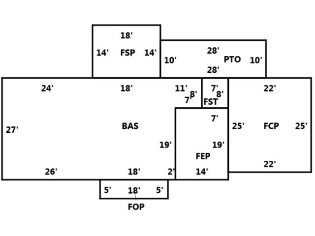 BUILDING DIMENSIONS BAS=W24S27E26E18E2N19E7N8W11W18Area:1298;FOP=E18S5W18N5Area:90;FEP=E14N19W7W7S19Area:266;FST=N8W7S8E7Area:56;FSP=W18N14E E18S14Area:252;FCP=E22S25W22N25Area:550;PTO=N10E28S10W28Area:280;TotalArea:2792