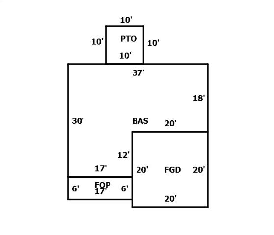 BUILDING DIMENSIONS BAS=W37S30E17N12E20N18Area:870;FOP=E17S6W17N6Area:102;FGD=E20S20W20N20Area:400;FUS=Area:1065;PTO=N10E10S10W10Area:100;To otalArea:2537