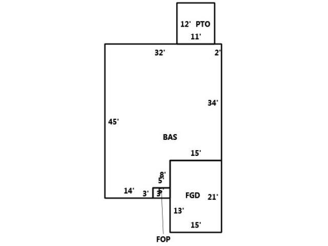BUILDING DIMENSIONS BAS=W2W32S45E14N3E5N8E15N34Area:1350;PTO=N12W11S12E11Area:132;FOP=E5N3W5S3Area:15;FGD=S13E15N21W15S8Area:315;TotalArea:1 1812