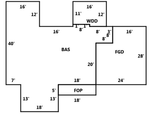 BUILDING DIMENSIONS BAS=W16S40E7S13E18N13E18N20E8N8W3W8N1W8S1W16N12Area:1702;FOP=E18S5W18N5Area:90;FGD=E24N28W16S8W8S20Area:608;WDD=N12W16S1 11E8S1E8Area:184;TotalArea:2584