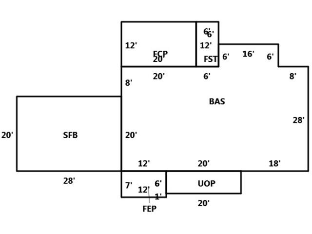 BUILDING DIMENSIONS BAS=W8N6W16S6W6W20S8S20E12E20E18N28Area:1496;FST=N6W6S12E6N6Area:72;FCP=W20S12E20N12Area:240;SFB=S20W28N20E28Area:560;FE EP=S7E12N1N6W12Area:84;UOP=N6E20S6W20Area:120;TotalArea:2572