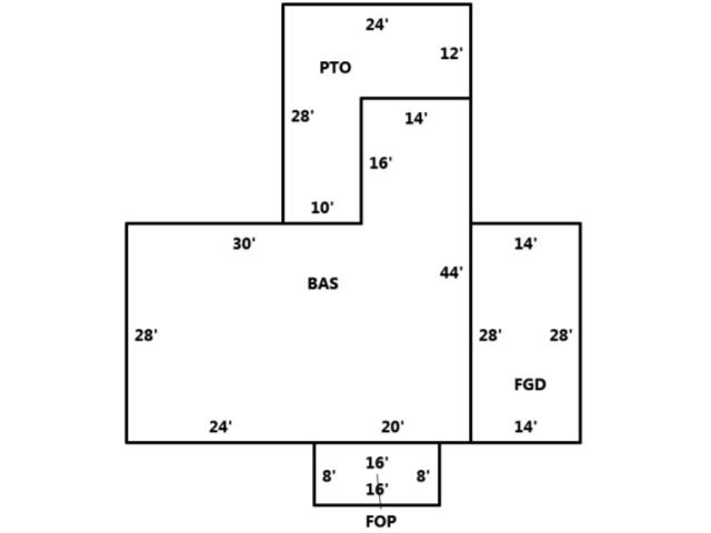 BUILDING DIMENSIONS BAS=W14S16W30S28E24E20N44Area:1456;FOP=S8E16N8W16Area:128;FGD=E14N28W14S28Area:392;PTO=N12W24S28E10N16E14Area:448;TotalA Area:2424