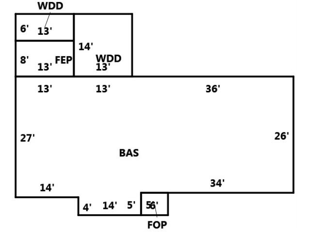 BUILDING DIMENSIONS BAS=W36W13W13S27E14S4E14N5E34N26Area:1696;WDD=N14W13S14E13Area:182;FEP=N8W13S8E13Area:104;WDD=N6W13S6E13Area:78;FOP=E6N5 5W6S5Area:30;TotalArea:2090