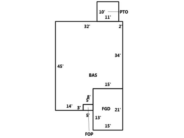BUILDING DIMENSIONS BAS=W2W32S45E14N3E5N8E15N34Area:1350;PTO=N10W11S10E11Area:110;FOP=N3E5S3W5Area:15;FGD=S13E15N21W15S8Area:315;TotalArea:1 1790