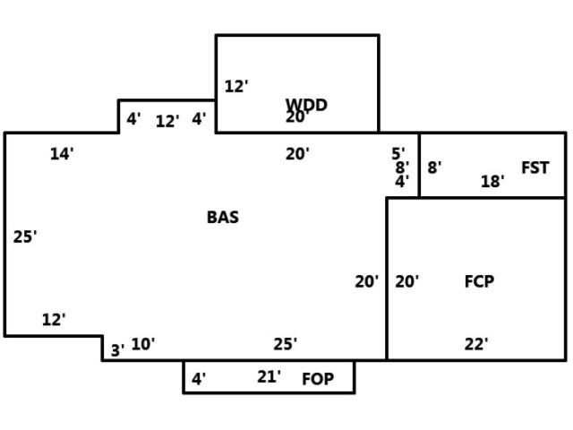 BUILDING DIMENSIONS BAS=W5W20N4W12S4W14S25E12S3E10E25N20E4N8Area:1360;WDD=N12W20S12E20Area:240;FOP=S4E21N4W21Area:84;FCP=E22N20W22S20Area:44 40;FST=N8W18S8E18Area:144;TotalArea:2268