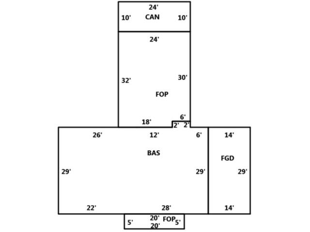 BUILDING DIMENSIONS BAS=W6N2W6S2W12W26S29E22E28N29Area:1462;FOP=S5E20N5W20Area:100;FGD=E14N29W14S29Area:406;FOP=N30W24S32E18N2E6Area:756;CAN N=N10W24S10E24Area:240;TotalArea:2964