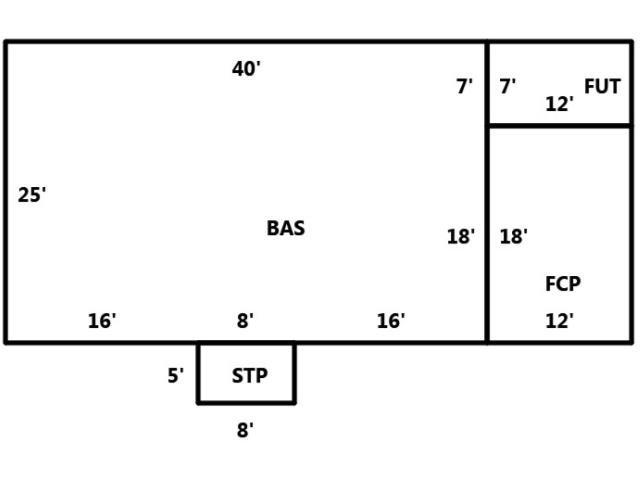 BUILDING DIMENSIONS BAS=W40S25E16E8E16N18N7Area:1000;STP=E8S5W8N5Area:40;FCP=E12N18W12S18Area:216;FUT=N7W12S7E12Area:84;TotalArea:1340