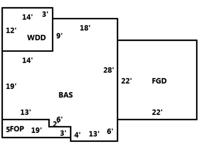 BUILDING DIMENSIONS BAS=W18S9W14S19E13S2E6S4E13N6N28Area:860;WDD=N3W14S12E14N9Area:168;FOP=S5E19N3W6N2W13Area:83;FGD=E22N22W22S22Area:484;FU US=Area:1240;TotalArea:2835