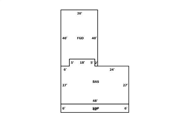 BUILDING DIMENSIONS BAS=W24N5W18S5W6S27E48N27Area:1,386.0;FOP=S6E48N6W48Area:288.0;FGD=E6N5E18S5E2N40W26S40Area:950.0;TotalArea:2,624.0