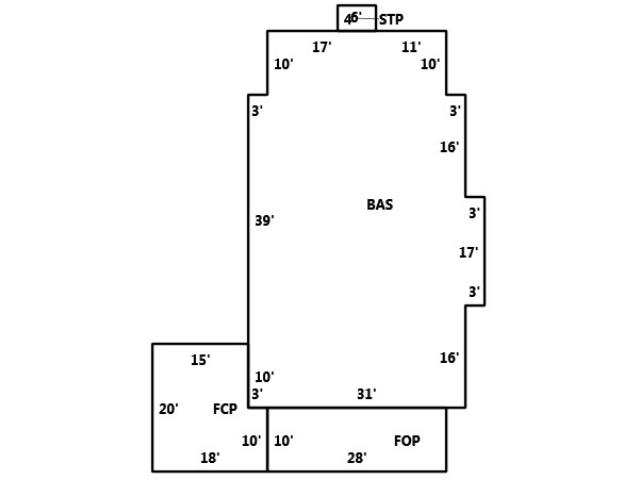 BUILDING DIMENSIONS BAS=W3N10W11W17S10W3S39S10E3E31N16E3N17W3N16Area:1997;STP=N4W6S4E6Area:24;FCP=W15S20E18N10W3N10Area:330;FOP=S10E28N10W28 8Area:280;TotalArea:2631