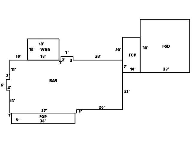 BUILDING DIMENSIONS BAS=W10S11W2S6E2S13E1E37N2E26N21N7W28N2W7S2W1W18Area:1894;FOP=S6E36N6W36Area:216;FOP=E10N20W10S20Area:200;FGD=E28N30W28S S30Area:840;WDD=N12W18S12E18Area:216;FUS=Area:1600;TotalArea:4966