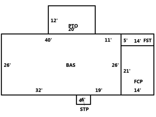 BUILDING DIMENSIONS BAS=W11W40S26E32E19N26Area:1326;PTO=N12W20S12E20Area:240;STP=S4E6N4W6Area:24;FCP=E14N21W14S21Area:294;FST=N5W14S5E14Area a:70;TotalArea:1954