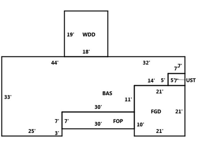 BUILDING DIMENSIONS BAS=W32W44S33E25N3N7E30N11E14N5E7N7Area:1732;WDD=N19W18S19E18Area:342;FOP=E30N7W30S7Area:210;FGD=S10E21N21W21S11Area:441 1;UST=N5W7S5E7Area:35;TotalArea:2760