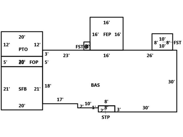 BUILDING DIMENSIONS BAS=W26W16W23S3S5S18E17S2E10N1E8S3E30N30Area:1838;FEP=N16W16S16E16Area:256;FST=N4W3S4E3Area:12;FOP=W20S5E20N5Area:100;SF FB=W20S21E20N21Area:420;STP=N1E8S3W8N2Area:24;FST=Area:256;FST=N8W10S8E10Area:80;PTO=N12E20S12W20Area:240;TotalArea:3226 6