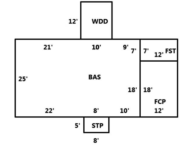 BUILDING DIMENSIONS BAS=W9W10W21S25E22E8E10N18N7Area:1000;WDD=W10N12E10S12Area:120;STP=E8S5W8N5Area:40;FCP=E12N18W12S18Area:216;FST=N7W12S7E E12Area:84;TotalArea:1460