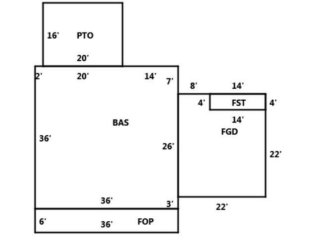 BUILDING DIMENSIONS BAS=W14W20W2S36E36N3N26N7Area:1296;PTO=N16W20S16E20Area:320;FOP=S6E36N6W36Area:216;FGD=N26E8E14S4S22W22Area:572;FST=E14S S4W14N4Area:56;FUS=Area:778;TotalArea:3238