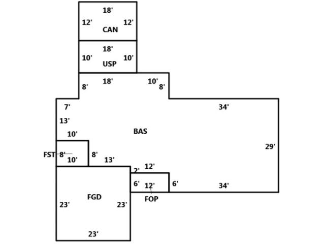 BUILDING DIMENSIONS BAS=W34N8W10W18S8W7S13E10S8E13S2E12S6E34N29Area:1889;FST=E10S8W10N8Area:80;FGD=W10S23E23N23W13Area:529;FOP=S6E12N6W12Are ea:72;USP=N10E18S10W18Area:180;CAN=N12E18S12W18Area:216;TotalArea:2966