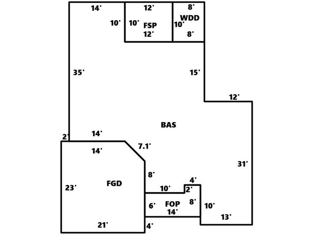 BUILDING DIMENSIONS BAS=E14S10E12E8S15E12S31W13N10W4S2W10N8NW@45-7.07W14N35Area:1569.5;FSP=E12N10W12S10Area:120;WDD=E8N10W8S10Area:80;FOP=S6 6E14N8W4S2W10Area:92;FGD=W2S23E21N4N6N8NW@45-7.07W14Area:470.5;TotalArea:2332