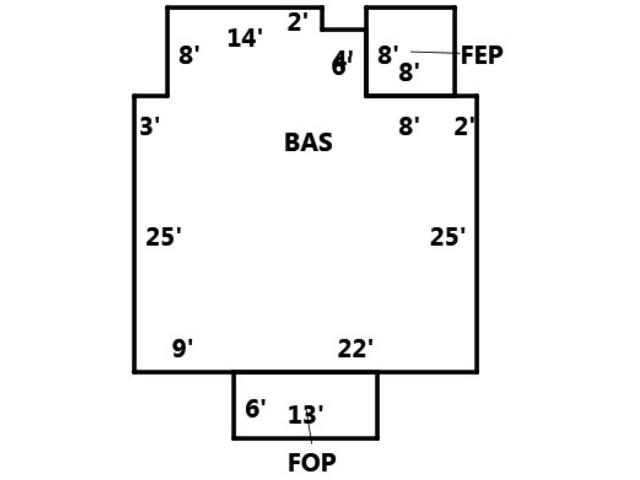 BUILDING DIMENSIONS BAS=W2W8N6W4N2W14S8W3S25E9E22N25Area:911;FEP=N8W8S8E8Area:64;FOP=S6E13N6W13Area:78;TotalArea:1053