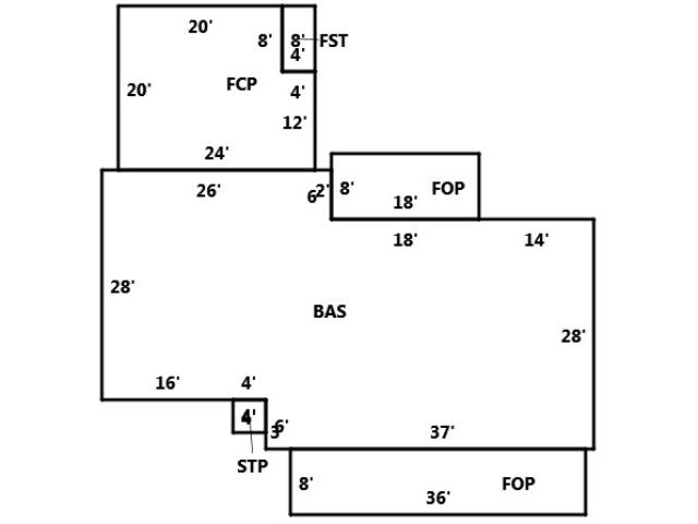 BUILDING DIMENSIONS BAS=W14W18N6W2W26S28E16E4S6E3E37N28Area:1728;FOP=N8W18S8E18Area:144;FCP=N12W4N8W20S20E24Area:448;FST=N8W4S8E4Area:32;STP P=S4E4N4W4Area:16;FOP=S8E36N8W36Area:288;FUS=Area:1142;TotalArea:3798