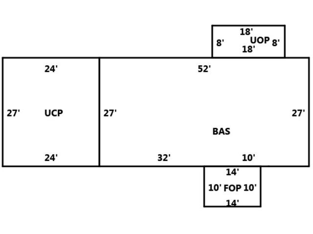 BUILDING DIMENSIONS BAS=N27W52S27E32E10E10Area:1404;UCP=W24S27E24N27Area:648;FOP=S10W14N10E14Area:140;UOP=N8W18S8E18Area:144;TotalArea:2336